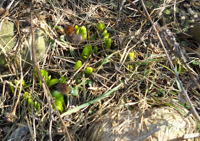 I took a lot of photos yesterday of bulb plants coming up but they were taken in a hurry and were blurry, you have to take my word on that. As you can see here the Sedum is about to come up. Our grass is still fairly brown but we have a few spots of green. I know that it is spring because I see my neighbor has already cut down one of his wonderful large burning bushes as he continues to remove all shrubs from a once very beautifully planted property. I have many sticks and limbs to now pick up from the two ice storms. Maybe I should wait until after next Wednesday to see what is going to happen.