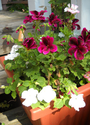 My side porch has this planting that is starting to fill in more fully with growth. I like these new geraniums with the pansy like flowers. It reminds me of the one that I have on the front porch that I blogged about before called Martha Washington. I don't know the name of this one but it's reds are different.
