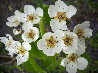 Pear blossoms are sparsely spaced on the tree this year. I guess the weather wasn't good for them early spring.