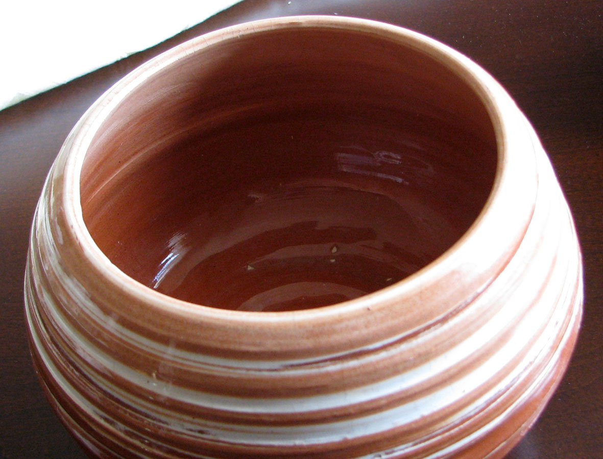 As a teacher in the art classroom I needed to teach many different things. The painting and the drawing are fun for me and I really did like teaching pottery. This pot was a demonstration pot that I created on the potter's wheel. It has red and white clay blended together and then was centered on the wheel. Creating a bowl in the usual manner allowed the two colors of clay to show up in the piece. Glazing it with clear glaze allows everyone to see the natural colors of the clay.