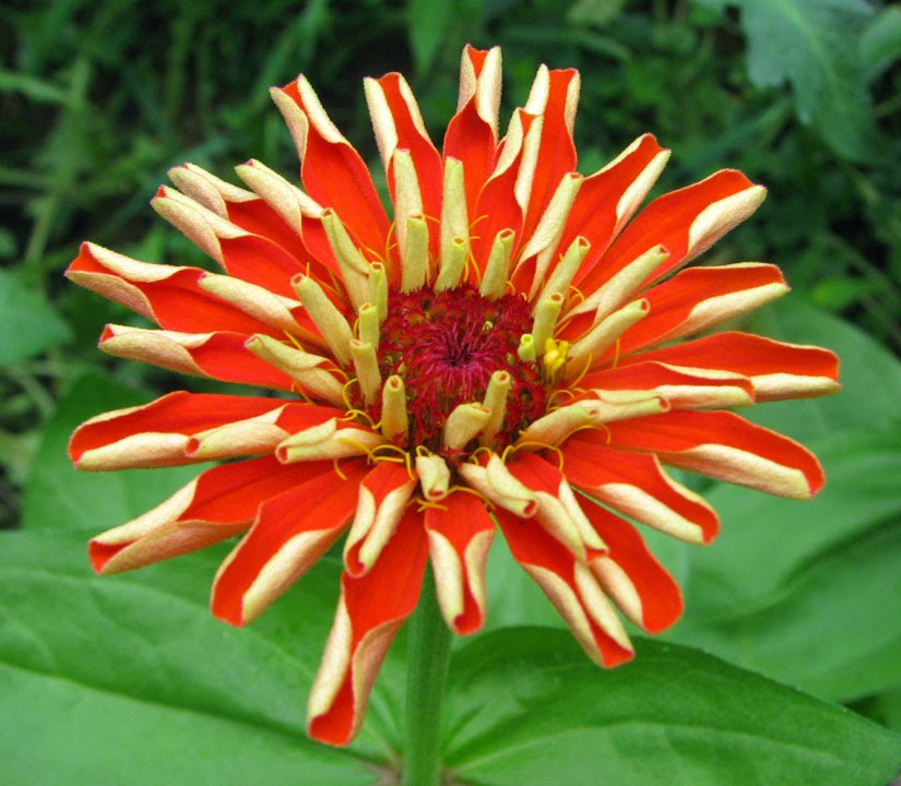 My first zinnia bloom has yet to come out in full bloom. The orange petals are still curled in and maybe today I will see a change in that. I have a couple more zinnias that are about to open. I know on this one pictured that the yellow parts sticking out do become little yellow flowers.