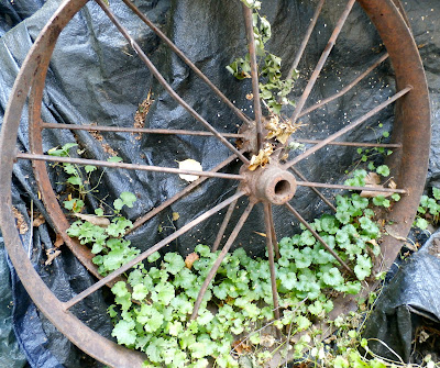 The old wagon wheels lean against my ugly pile of tires. Either it has been too hot to deal with the tires or it has been raining. The tarp keeps people from seeing a pile of tires but I don't like the look of any of it.