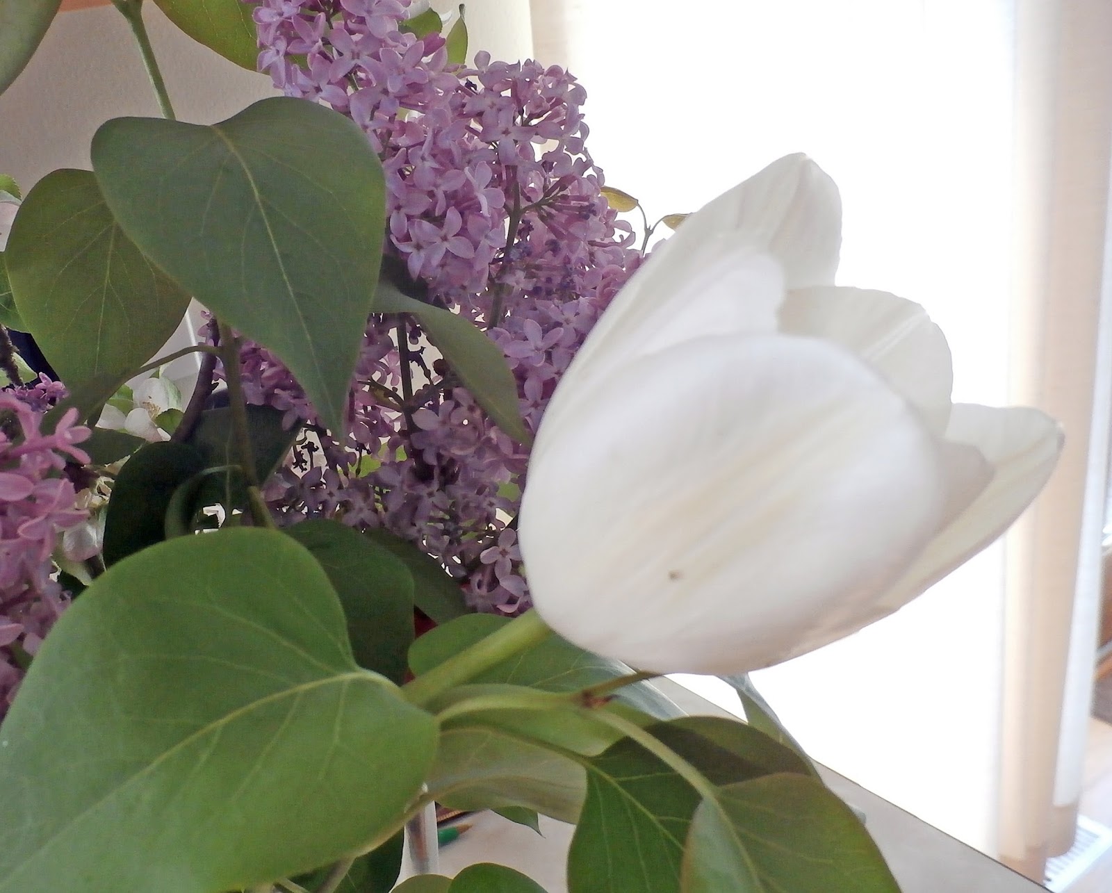 I really had to work hard to get this photo. The tv remote kept being in the photo. The inside of the tulip has dirt in it so I couldn't shoot it in front. The dog's water dish shows up in some of them and everything on the kitchen counter wants to get into the photo. The lilac blooms also seem a little weary from the continue three or four days of rains.