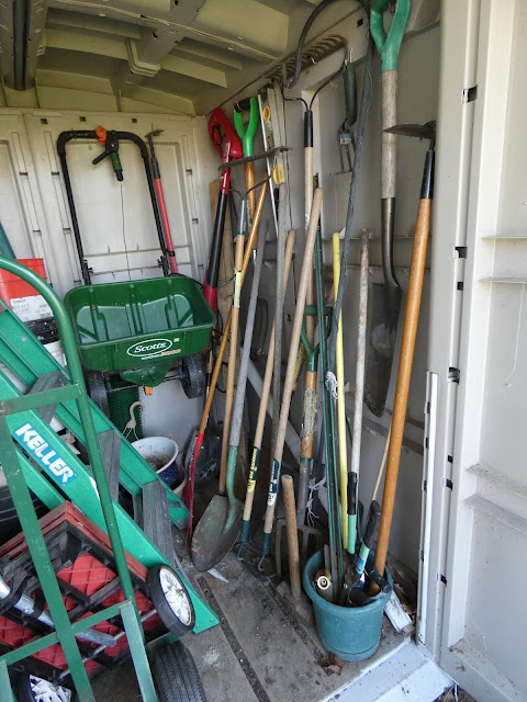 My son who was visiting opened the shed door and a rake fell out and hit him in the head. He said it made him mad so he rearranged the shed making it handier and safer. It is nice to have all the garden tools on the side of the shed. Hanging the spreader gave it more room also. That ladder could go up into the garage but that is way up the hill. I will move it and the red tote wagon could just go away. Andy our son is handy.