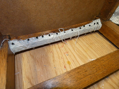 Once everything is in place the cloth is wrapped around the base boards way underneath. The cloth can be somewhat stretched tightly again and tacks are then hammered into the wood. The past restorers place their nails on the bottom side of the boards which meant you caught your hands on them when you carried.